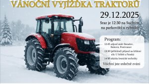 (Datum konání: 29. 12. 2025) Daniel Menšíků zve na druhý ročník Vánoční vyjížďky traktorů: Letos se potkáme na parkovišti u rybníka na Suchým a poté se všichni spanilou jízdou přes Benešov a Bukovou přesuneme do… více informací