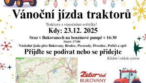 (Datum konání: 23. 12. 2025) V úterý 23. prosince 2025 se uskuteční vánoční jízda traktorů s vánočními světýlky. Sraz účastníků je naplánován na 16:30 u benzínové pumpy v Bukovanech, odkud jízda odstartuje v 17:00. Trasa… více informací