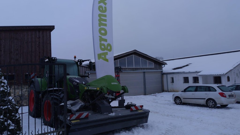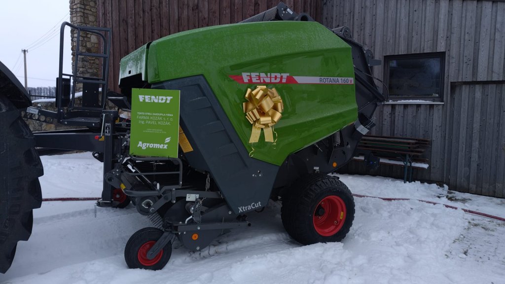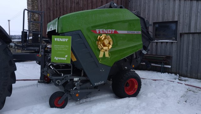 Právě do pícninářské linky nyní přibyl poslední dodaný kus – lis na kulaté balíky Fendt Rotana 160 V Xtra. Na fotografiích z akce je vidět nový lis v typickém „předávacím“ provedení se stuhou a označením dodavatele, připravený do každodenní práce.
