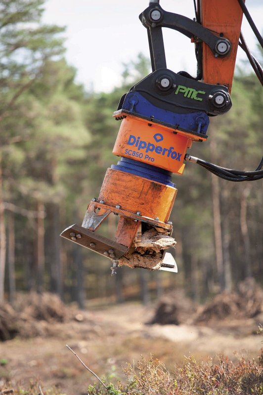 Společnost Dipperfox na veletrhu představila technologii, která pracuje na odlišném principu. Zařízení agregované na výložník rýpadla a hydraulický systém nosiče využívá vysoký krouticí moment. Speciálně konstruovaný vrtací nástroj pak proniká do pařezu a postupně rozrušuje jak dřevní hmotu nad zemí, tak i kořenový systém pod úrovní terénu.