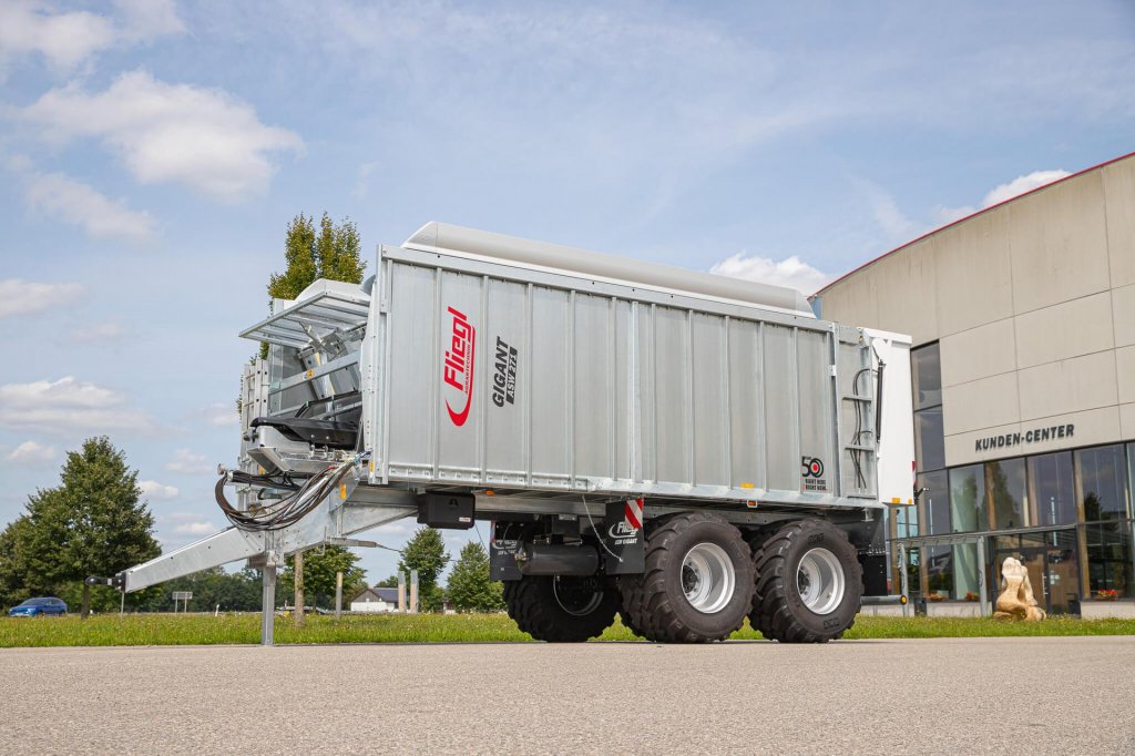 - Zadní stěna: hydraulická velkokapacitní zadní stěna 800 mm s posunovačem zrna speciálně lakovaná ve stylu „50 Jahre Fliegl“