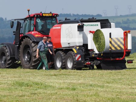 „U travních porostů děláme za sezonu dvě seče, pícniny na orné půdě sklízíme třikrát. V první seči sklízíme na senáž a na seno asi 450 hektarů travních porostů plus pícniny na orné půdě. V druhé seči, když vyjde počasí, je přibližně stejná výměra trav, ale některé plochy se musí přepást a potom je mulčujeme. Naštěstí nemáme velkou svahovitost, i když jsou místa, kde se obsluha při sjíždění do údolí zapotí,“ poznamenal Ing. Luděk Havelka. Co se týče výkonnosti a provozní spolehlivosti strojů Pöttinger na pícniny, jak uvedl Ing. Havelka, nemá důvod tuto značku měnit.