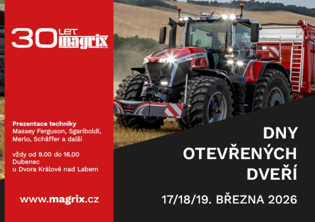 Zveřejněno: 18.03.2026Za redakci Agroportal24h jsme se vypravili na Dny otevřených dveří společnosti Magrix do Dubence, které se konaly ve dnech 17. až 19. března 2026. Akce se konala v rámci oslav 30 let společnosti. Součástí byla prezentace techniky značek Massey Ferguson, Sgariboldi, Merlo, Schäffer a dalších. Nechybělo ani již tradičně vynikající občerstvení, příjemná společnost a přátelská atmosféra.