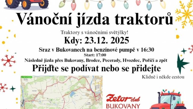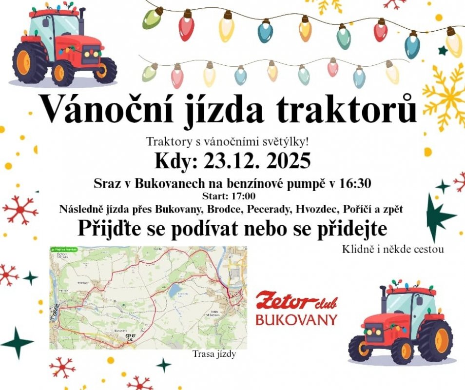 V úterý 23. prosince 2025 se uskuteční vánoční jízda traktorů s vánočními světýlky. Sraz účastníků je naplánován na 16:30 u benzínové pumpy v Bukovanech, odkud jízda odstartuje v 17:00. Trasa povede přes Bukovany, Brodce, Pecerady, Hvozdec a Poříčí, poté se kolona vrátí zpět do Bukovan.