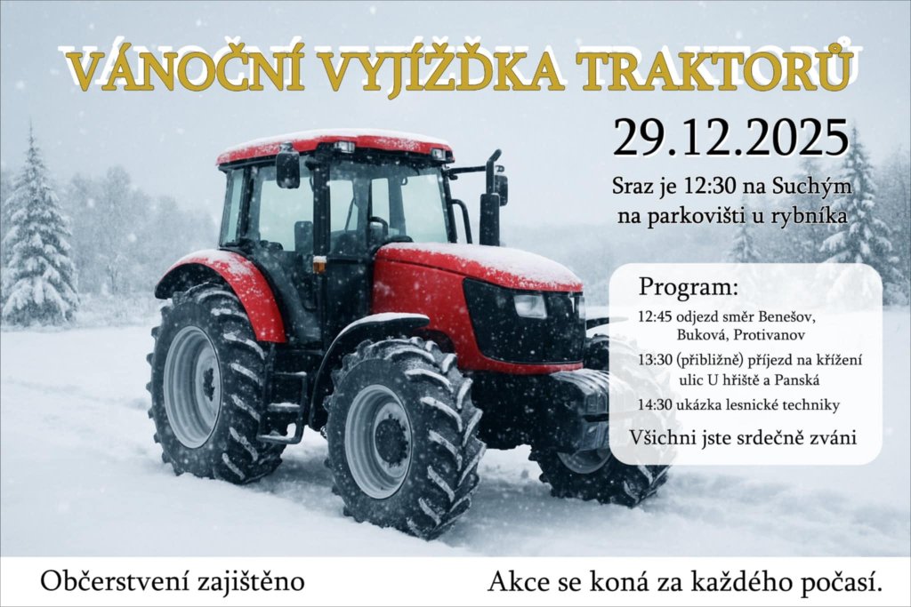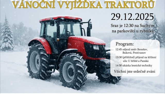 Daniel Menšíků zve na druhý ročník Vánoční vyjížďky traktorů: Letos se potkáme na parkovišti u rybníka na Suchým a poté se všichni spanilou jízdou přes Benešov a Bukovou přesuneme do Protivanova.