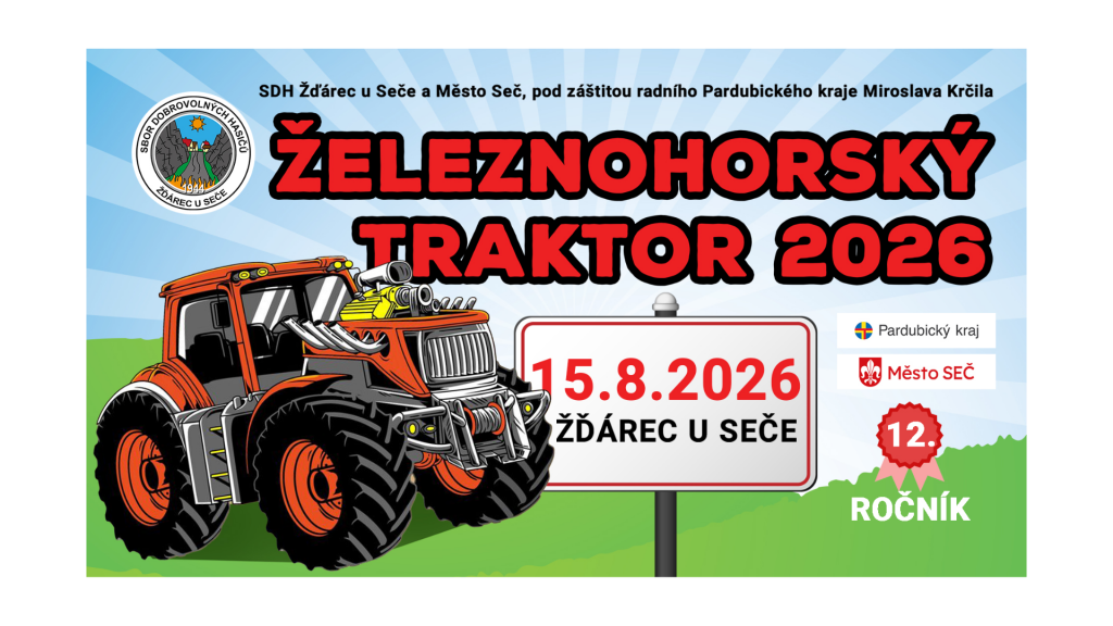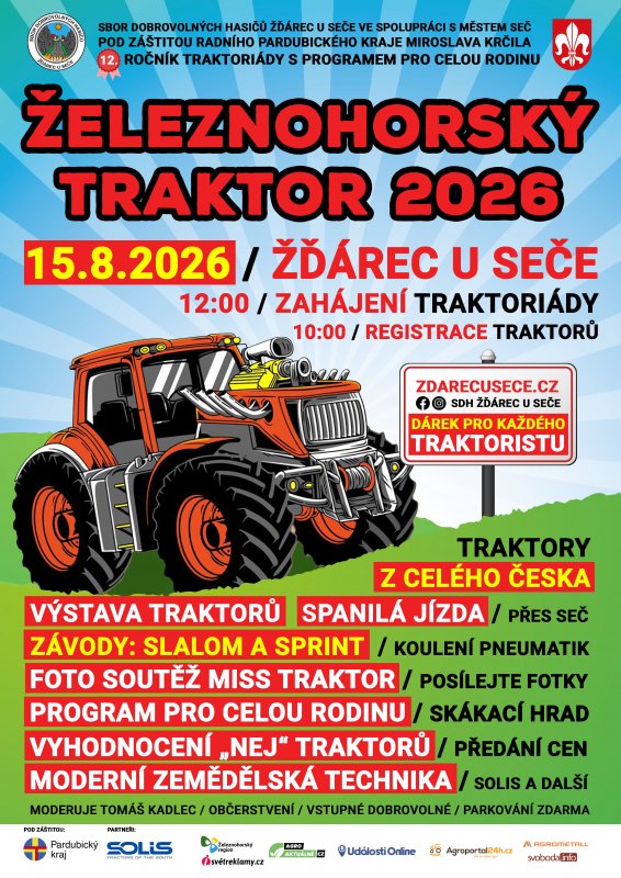 12. ročník Železnohorského traktoru se koná v sobotu 15. 8. 2026 ve Žďárci u Seče, v areálu za kulturním domem. Ve 12:00 proběhne zahájení celého programu. Registrace traktoristů budou probíhat od 10:00 u vjezdu do areálu za kulturním domem.
